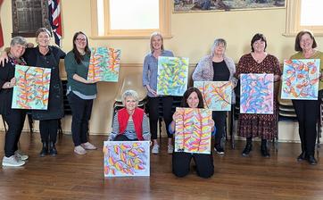Definitely the most basic of all the workshops. Tulips is a perfect introduction to the 'non believers' who think they can't paint. You can allow yourself to loosen up a bit and allow those 'paint drips' to fall. I use simplified techniques to create lines and shapes across the canvas using rags, stamp tools, pipettes and brushes.